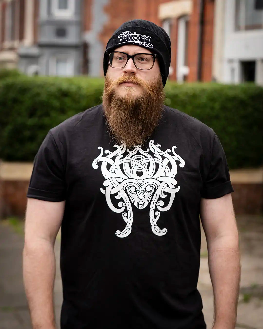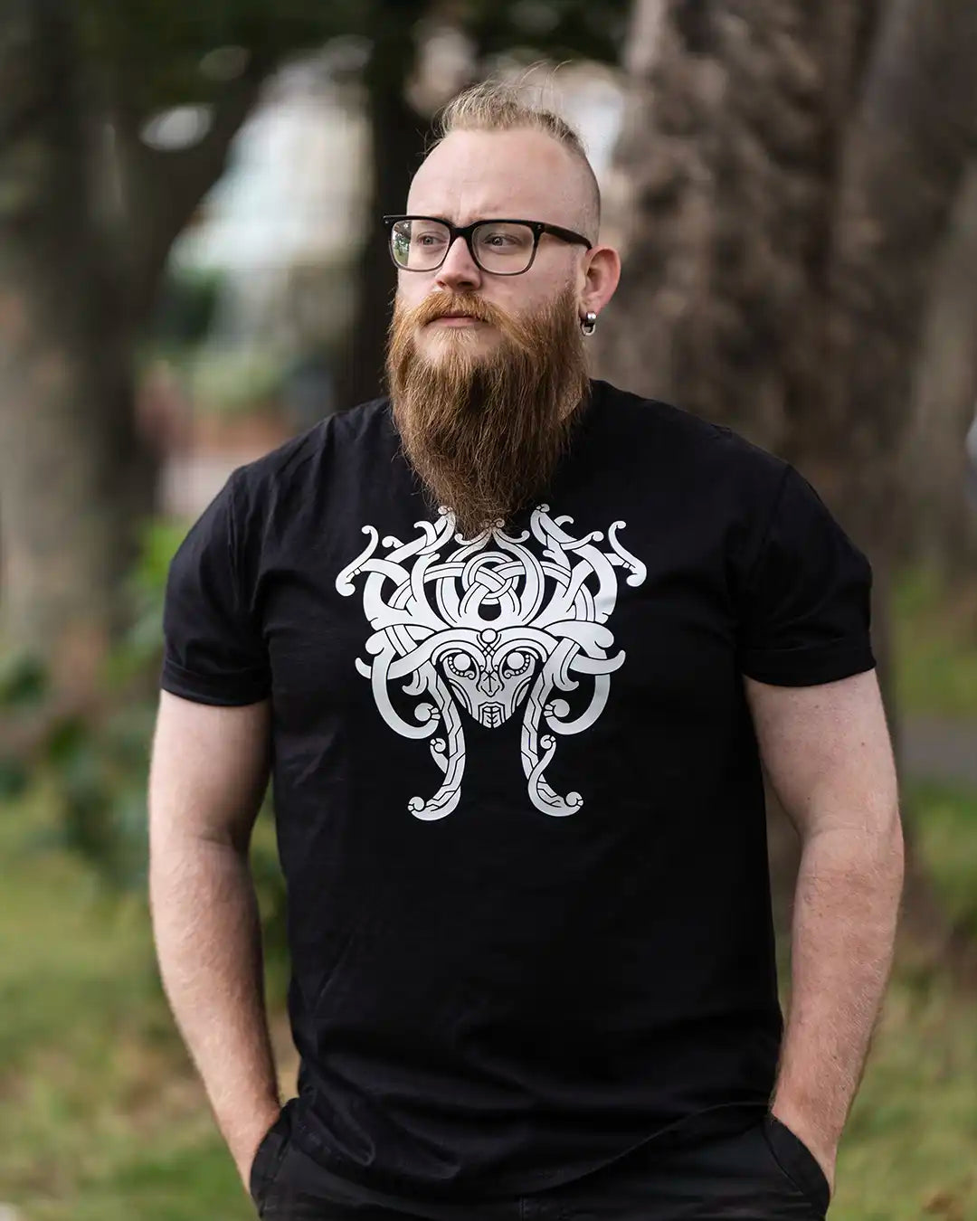 This black unisex t-shirt features a bold Godmask of Freya, the Norse goddess of love, war, and magic. Freya stands for independence, intuition, and strength - power carried with calm and purpose.