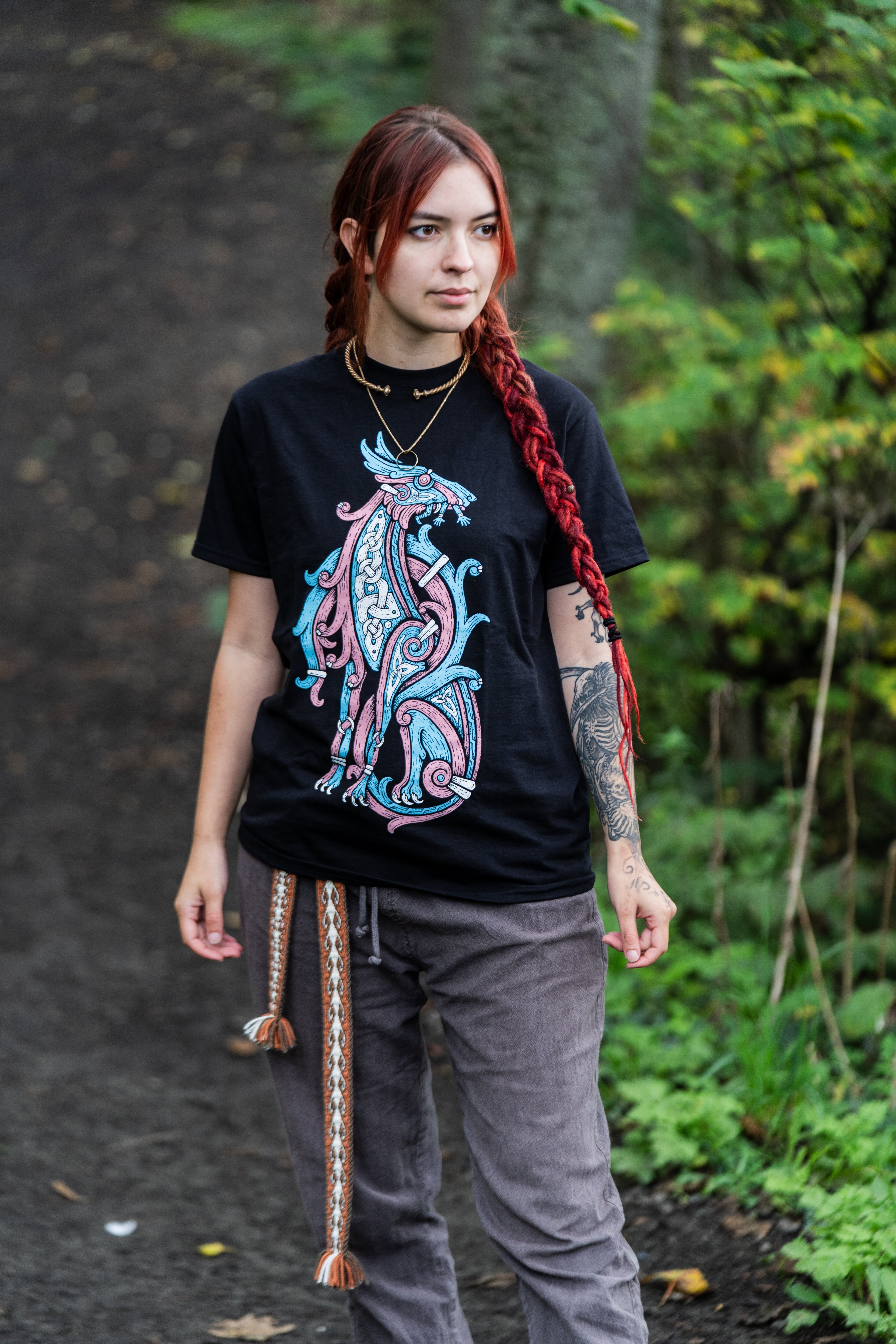 This shirt shows Fenrir, the great wolf from Norse mythology, eating a fascist. It’s a clear message against hate and a show of support for the Trans community.