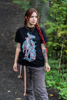 This shirt shows Fenrir, the great wolf from Norse mythology, eating a fascist. It’s a clear message against hate and a show of support for the Trans community.