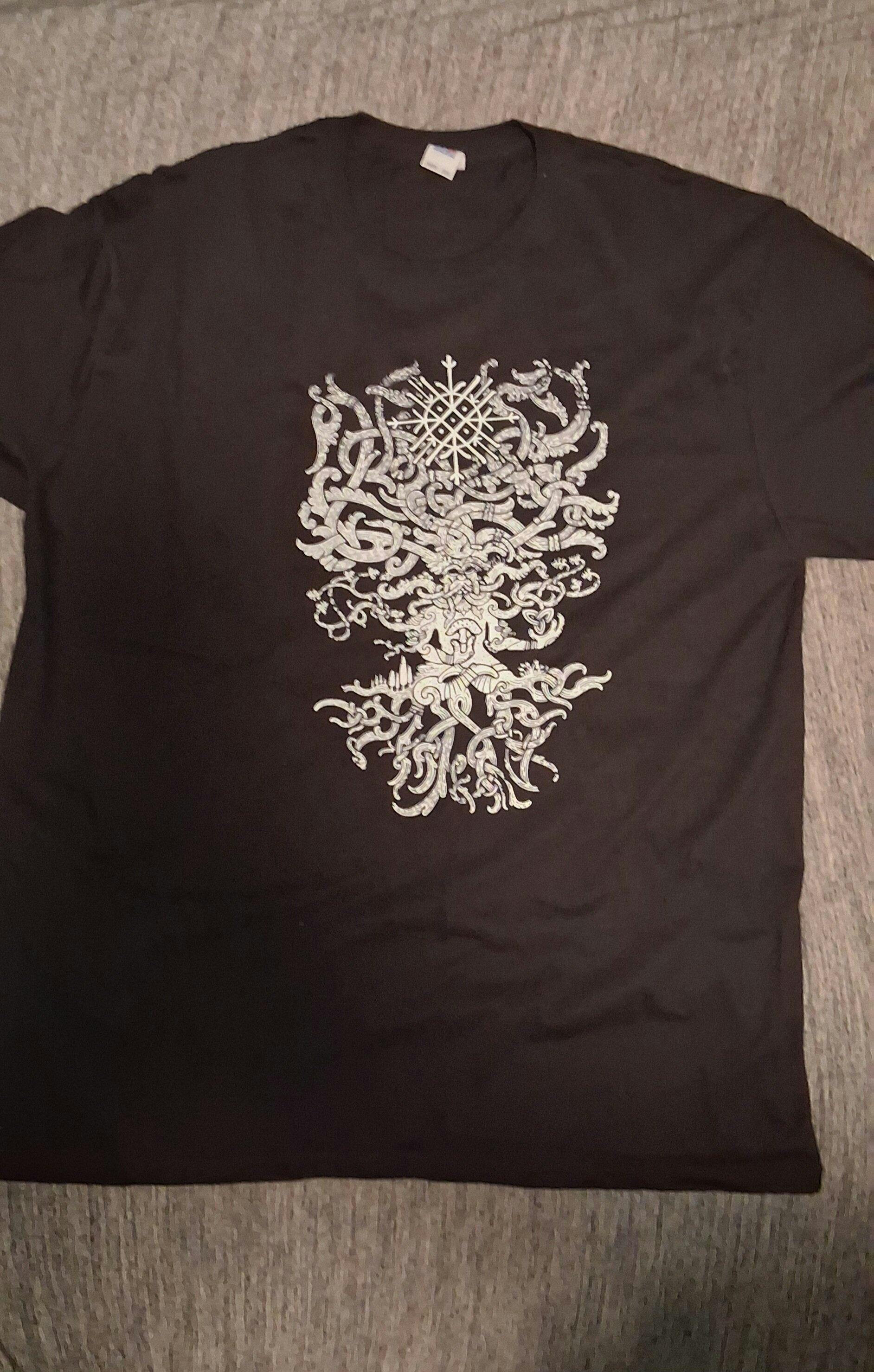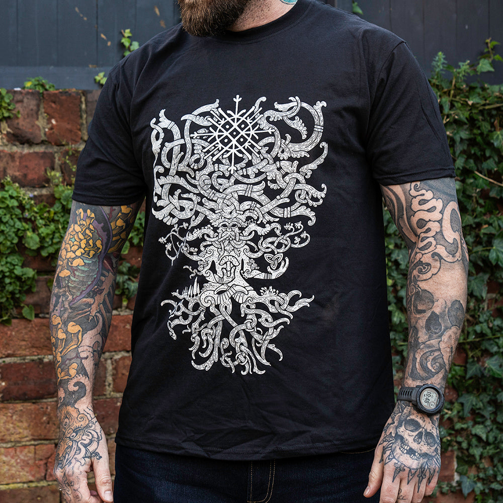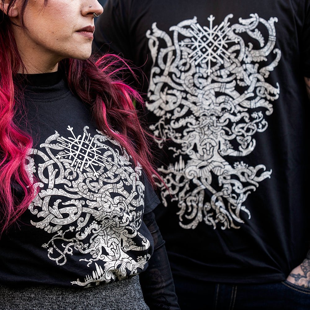 The artwork draws from the Buddha Bucket of the Oseberg Ship and the Horned God of the Gundestrup Cauldron, merging those ancient motifs with Viking-age style and Isar Oakmund’s hand-drawn detail.