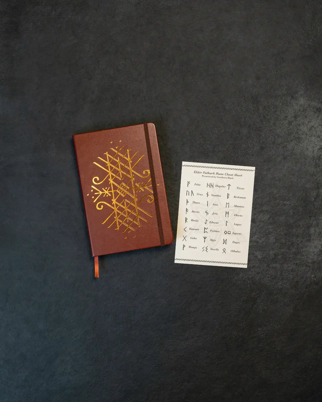 Bound in deep red vegan leather and finished with a gold Web of Wyrd bindrune designed by Isar Oakmund, this notebook is both practical and symbolic. Inside, you’ll find thoughtfully designed page layouts created specifically for rune work - from single-rune pulls to complex bindrune constructions and multi-stone readings.