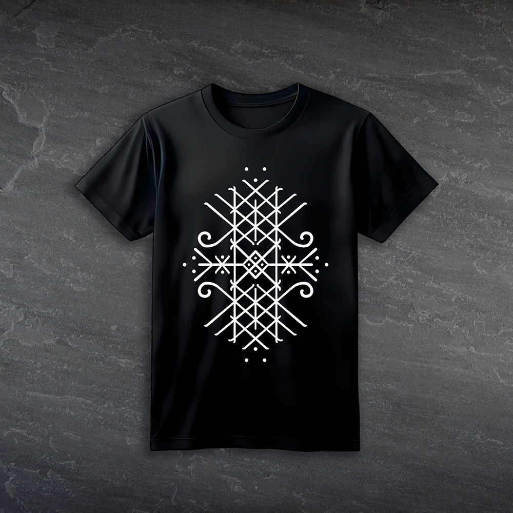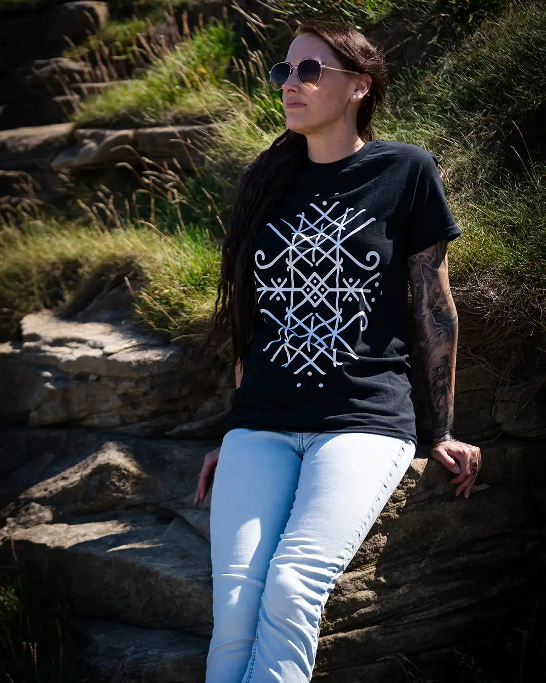 This t-shirt features the Web of Wyrd, a symbol that brings together all the runes in one woven design. The original concept appeared in Helrunar by Jan Fries in 1993 - a modern interpretation of old ideas about fate, time, and the threads that bind them.