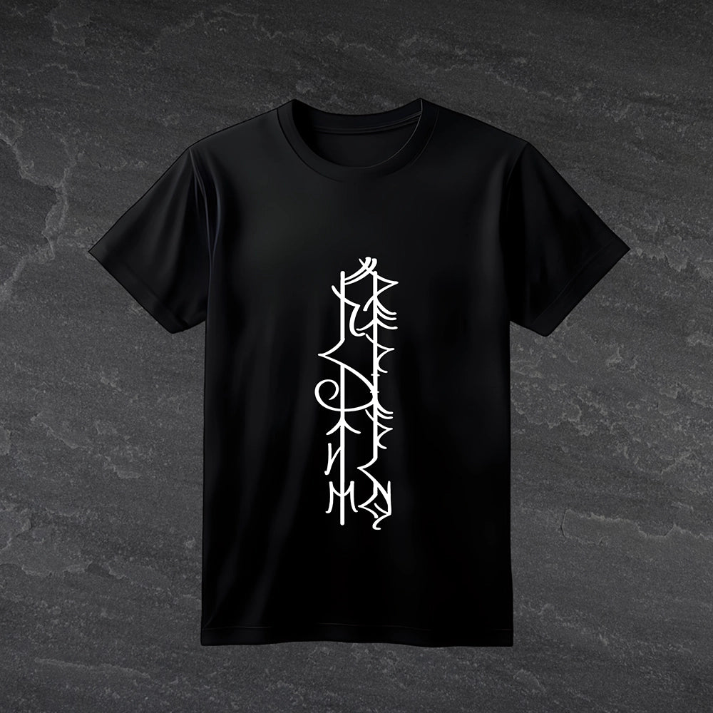 The design consists of runes that read “fuck the patriarchy” bound together in a double stave, with added flourish which makes this tee both an attractive design and an important statement. Bindrune design by May Oakmund. On our classic black T-shirt with a white print.
