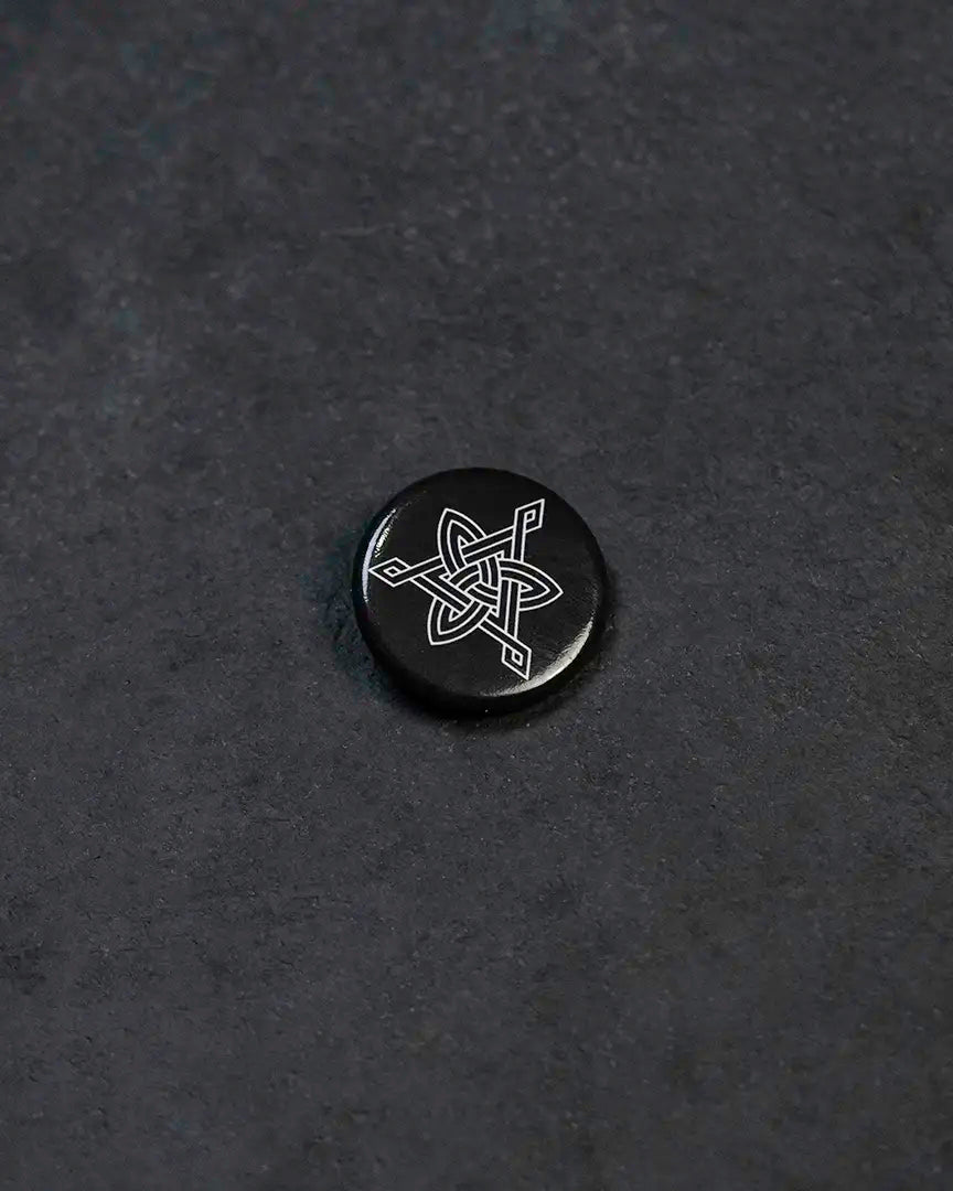 This small black button badge features the Northern Black logo in crisp white - a minimal and bold symbol rooted in ancient European design.